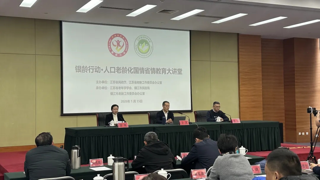1月15日下午,“‘银龄行动 聚力生辉’——2026年江苏省人口老龄化国情省情教育大讲堂”在镇江举行。活动由省民政厅、省老龄办主办,省老年学学会、镇江市民政局、市老龄办承办,旨在落实积极应对人口老龄化国家战略。